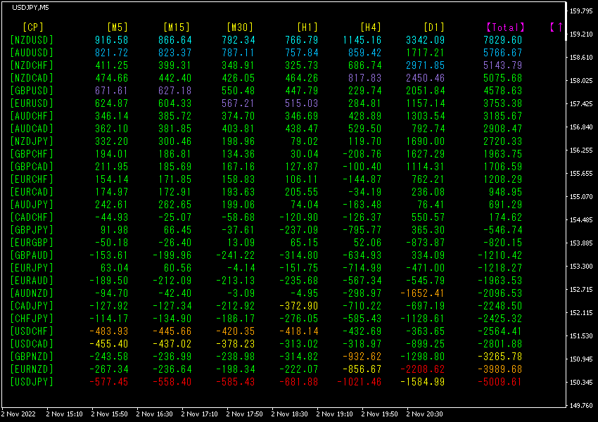 Total数値で降順に並べ替えしています。一番上の行にあるNZDUSDが、[M5][M15][M30][H1][H4][D1][Total]の全ての数字が水色になっていて、Total数値も7829.60と著しく大きな数値になっています。極端な上昇トレンドがその時に発生していたことを示しています。