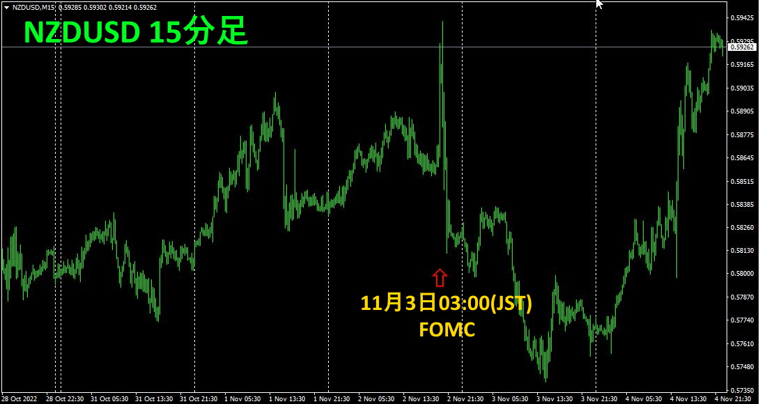 日本時間で11月3日の午前3時にFOMCの政策金利発表があった為、この影響でレートが乱高下したのだと分かります。
