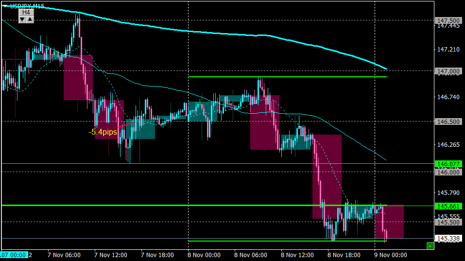 昨日は、切り上げラインなどサポートになりそうな節目が複数あったのでロングを検討していたが、サポートされることなく下抜けた。