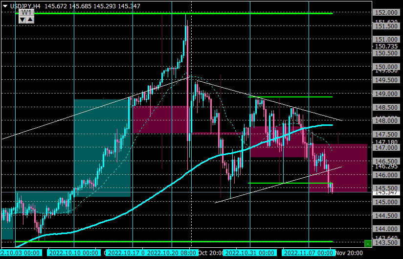 現在はH4レベルの大きなWトップのネックライン145.50付近。