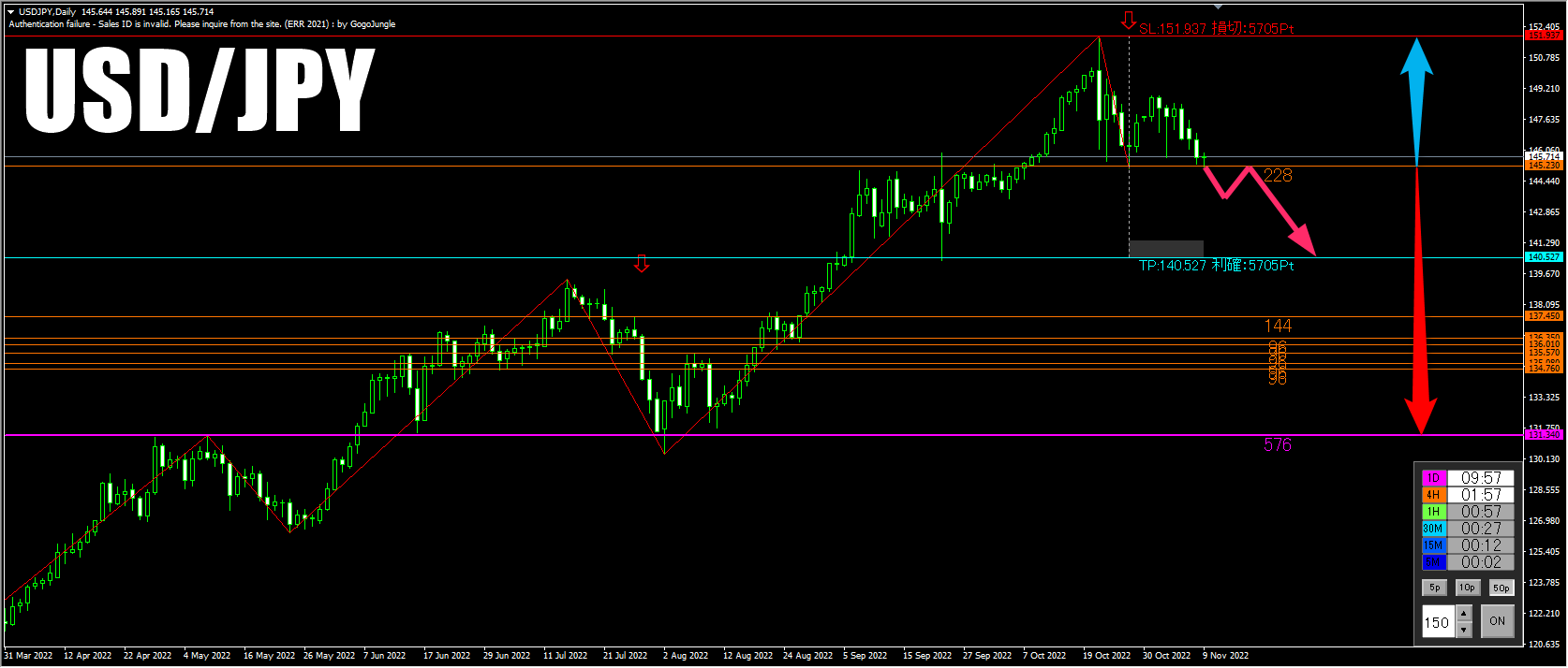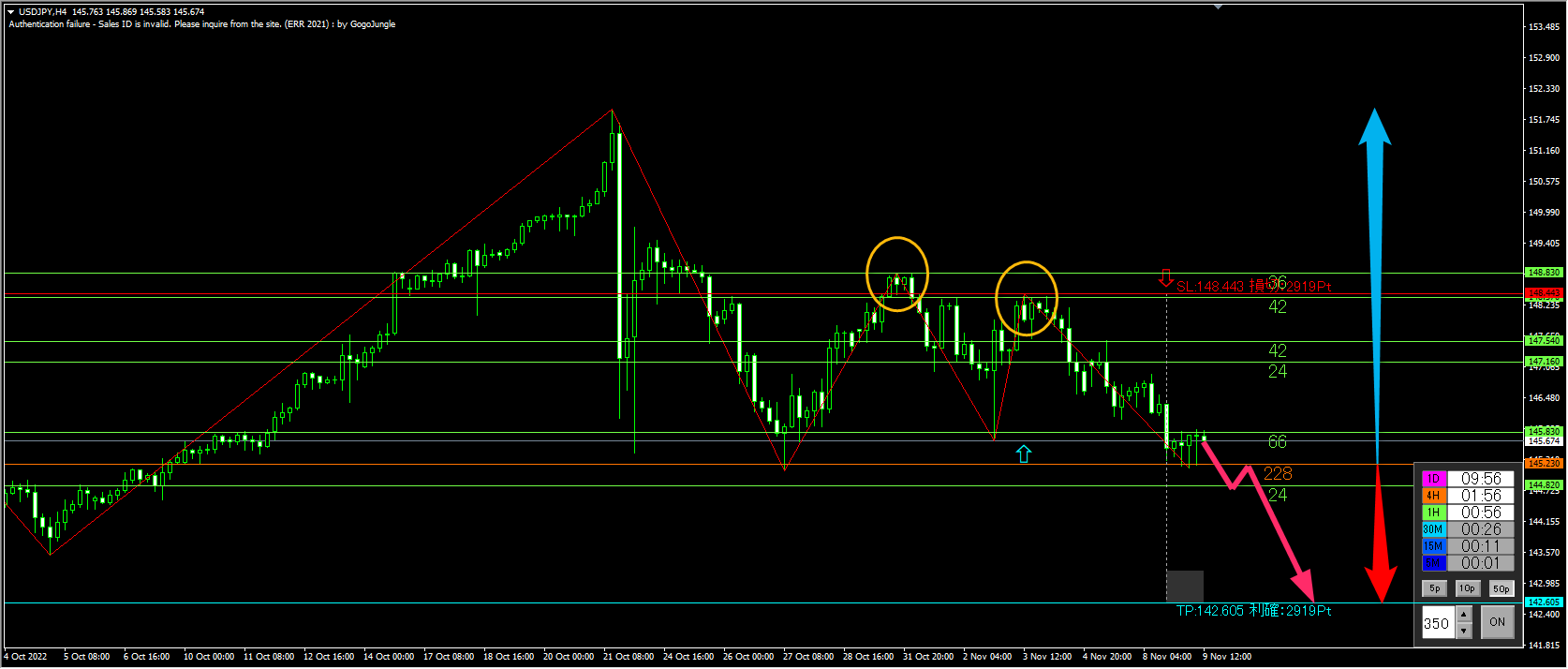 4時間足で意識されるオレンジライン(228)が、ちょうど節目150円付近にあります。