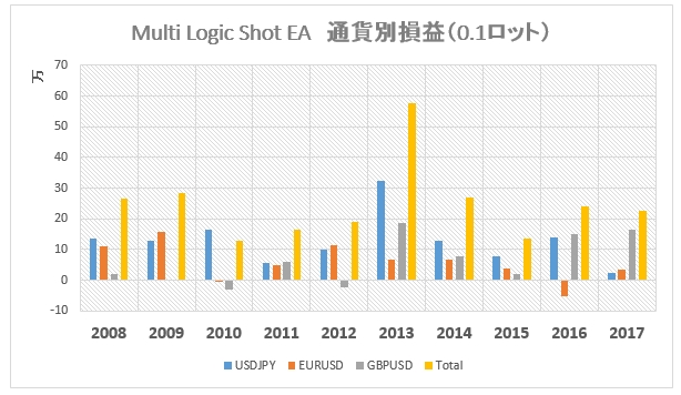 EURUSDやGBPUSDはマイナス年がある年もありますが、ドル円の利益の少ない年に多く稼いでいる