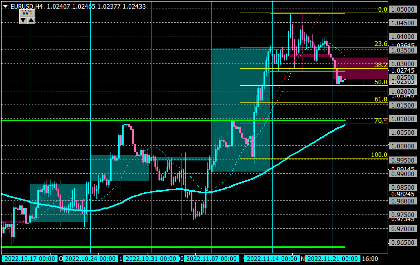 現在のレート1.0250付近は、2週前の上昇波の半値付近で押し目が入りそうな水準。