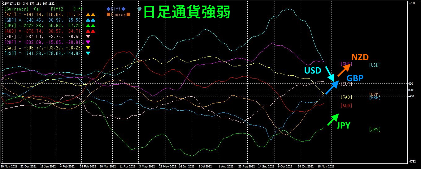 あれほど強さを誇っていたUSDですが、日足ではCHFに最上位を奪われました。一方で、NZD、GBP、JPY、AUDは上向いています。