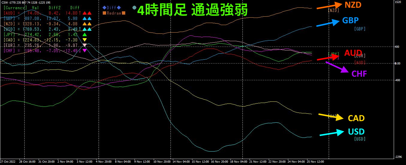 日足の通貨強弱グラフ、4時間足の通貨強弱グラフを順に見ていくことにします。