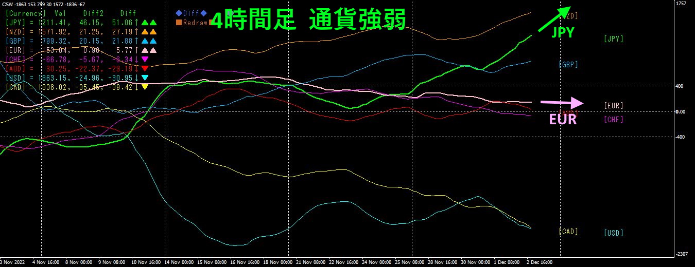 ピンク色がEUR、緑色がJPYです。通貨強弱グラフを見ると、EURは水平からやや下向きなのに対して、JPYは大きく上昇しています。結果としてEURJPYは下落します。この間のEURJPYの下落は、円高によるものであることが示されます。