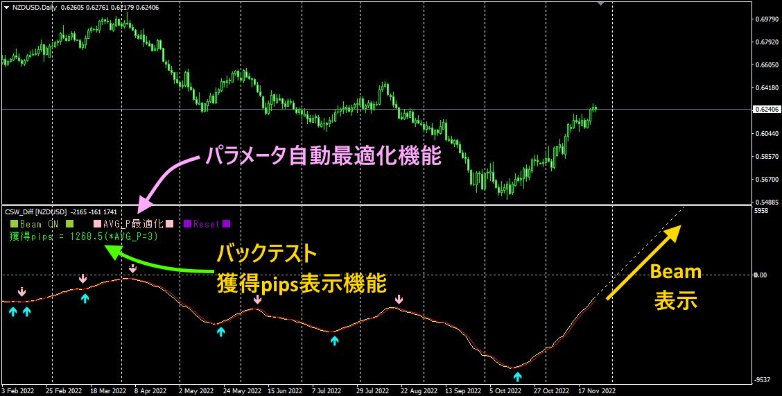 特に、今のところでは、NZDUSDが絶好調で、このインジケータを購入されてNZDUSDの買いポジションを建てた方は、どんどん含み益を伸ばしています。