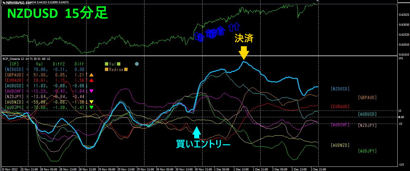 他の通貨ペアに比べて、NZDUSDの上昇が著しいです。上半分は、NZDUSDの15分足チャートで、下半分は、「8CP見える化インジケータ」によるものです。水色太線のグラフがNZDDUSDに相当します。