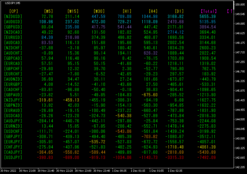 Total数値で降順に並べ替えしています。最下行のUSDJPYが、全時間足で赤色表示になっていて、Total数値も-7492.09とマイナス数値が大きくなっています。USDJPYに大きな下降トレンドが発生していることを示しています。