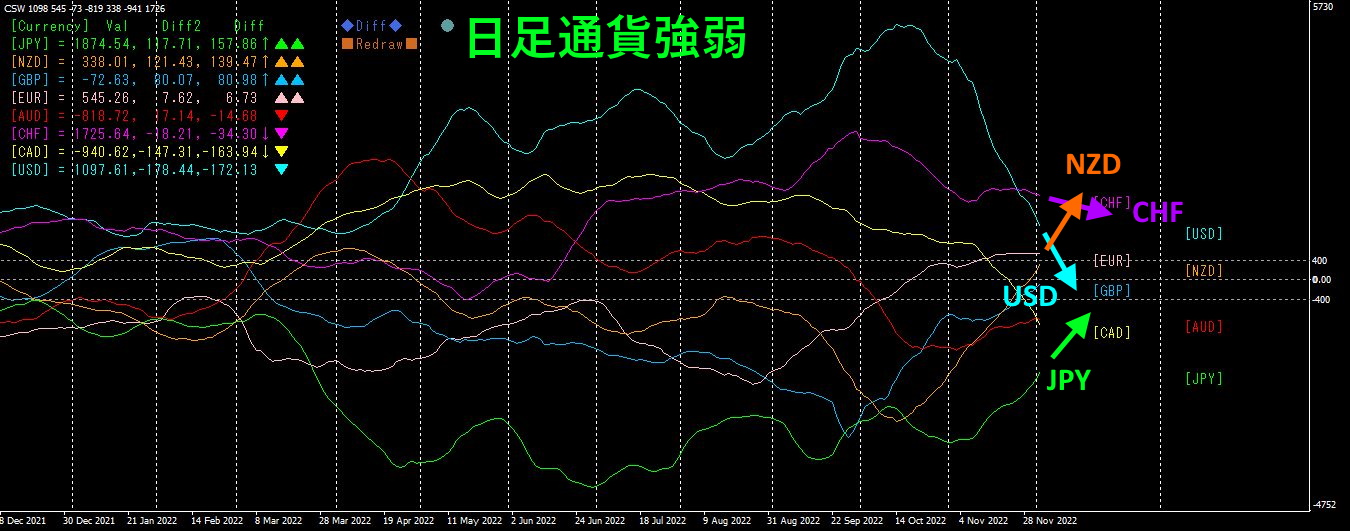 USDがさらに下落してきました。逆に最も弱かったJPYが急角度で上昇中です。「円高」方向に流れが変わってきました。NZDもJPYに次いで上昇角度が大きくなっています。日足通貨強弱チャートを見るだけで、今はUSDJPYを売り、NZDUSDを買えば良いというのが読めます。やっぱり王道のトレードは日足です。