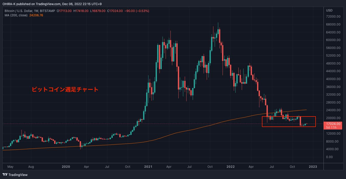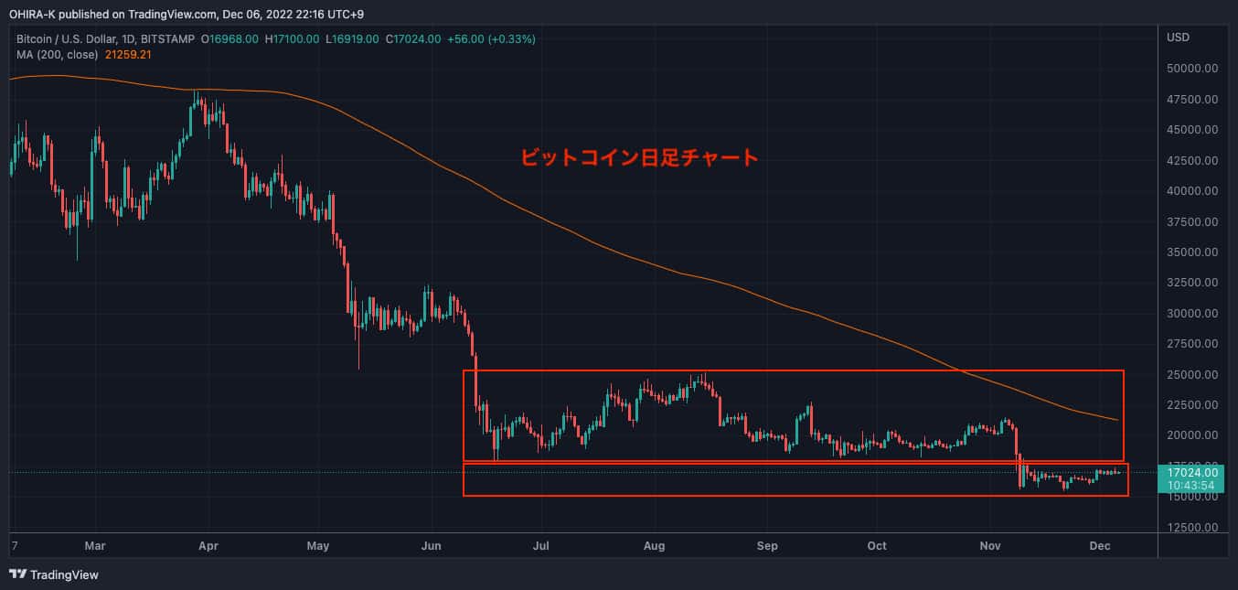6月からのレンジ相場内(赤の水平線で囲まれたところ)で推移していたビットコインですが、レンジ相場の下限(下の方の赤線)の今年最安値の価格をFTXの破綻ニュースを契機に下に割りました。