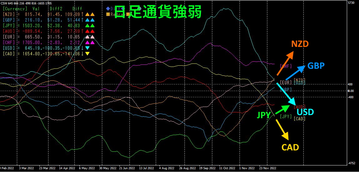 日足の通貨強弱グラフ、4時間足の通貨強弱グラフを順に見ていくことにします。