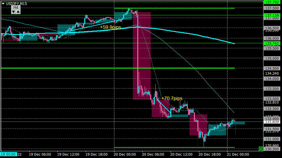 132.0までは下げると考えていたのでイグジットしたが、その後も下落した。+70pips