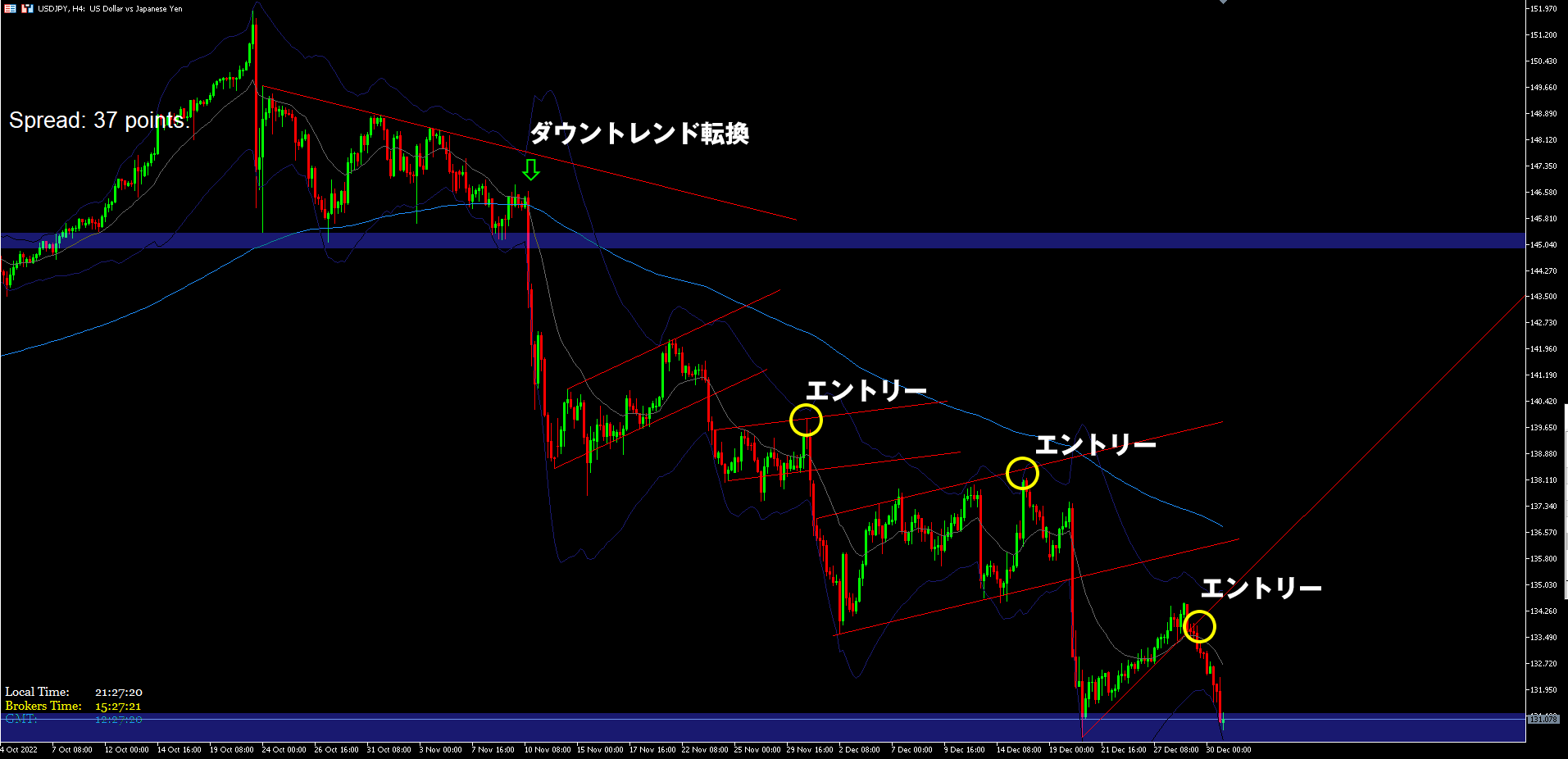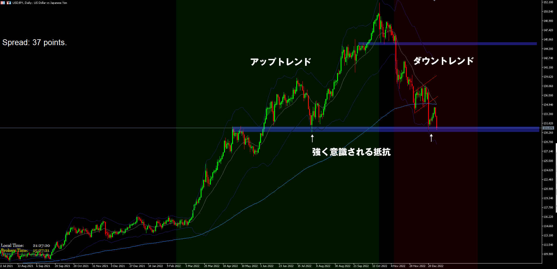 そこで上昇トレンドであればWトップやヘッドアンドショルダー、