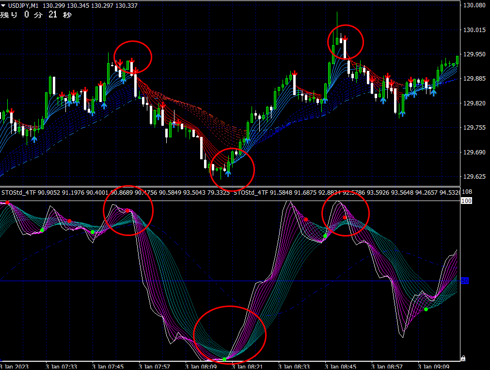 ※ 1分足用インジケーターとして説明しておりますが、当インジケーターは