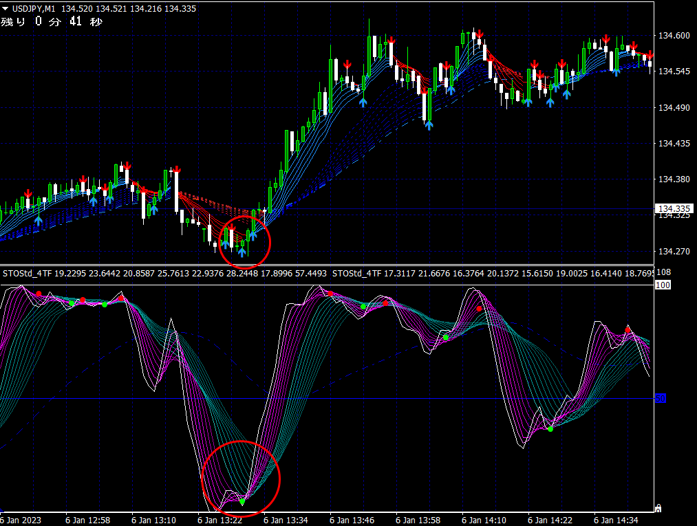 ※ 1分足用インジケーターとして説明しておりますが、当インジケーターは
