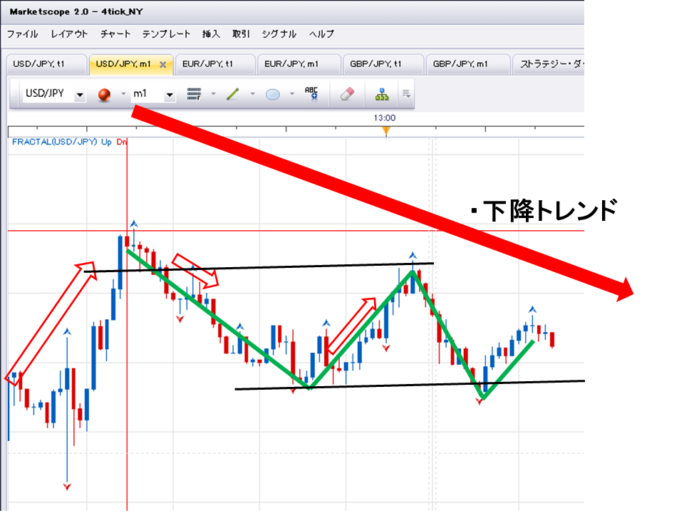その後、③にて下値切り下げし、下降トレンド継続となった。