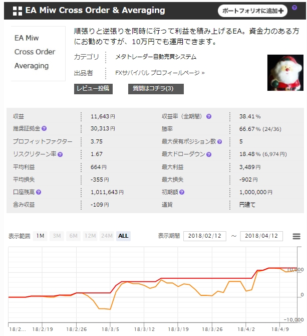 特記事項:取引通貨ペアは3年以上のバックテストを行って結果の良かったものです。原理的には、パラメーター変更により、あらゆる時間軸・銘柄での運用が可能です。