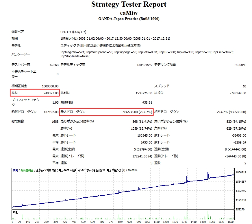 EA_miwはどの通貨ペアでも運用することができますが、安全に運用したい!という場合は長期間のバックテストで最大ドローダウンと最大ロット数を把握しておくことが重要です。