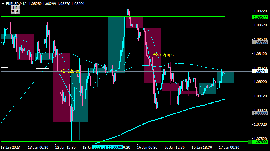 H4MAがサポートになっていたので、その直前のキリ番1.080でイグジット。+35pips