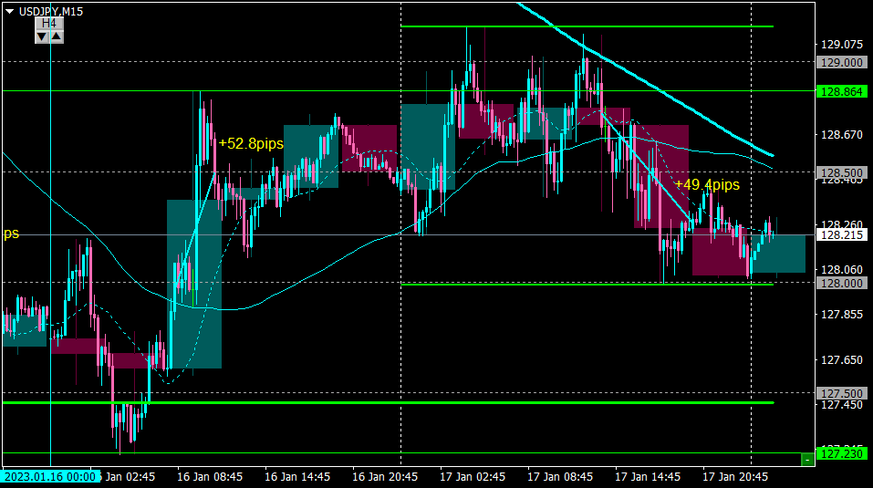 昨日は前日高値付近の129.0やH4MAを上抜けるかに注視していたが、トリプルトップを作り上抜け期待がなくなったところで逆張りのショート。+49pips