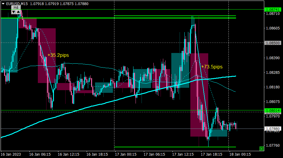 〇前日のトレード・USDJPY ドル円(15分足)昨日は前日安値を割り込んだタイミングでショート。夜までホールドしM15レベルのダウが変わったタイミングでイグジット。+61pips・EURUSD ユー
