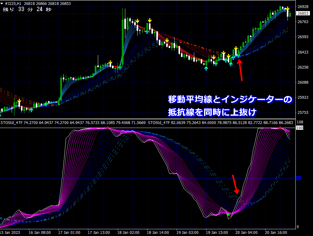 本商品では、移動平均線だけでなくインジケーターの曲線帯にも