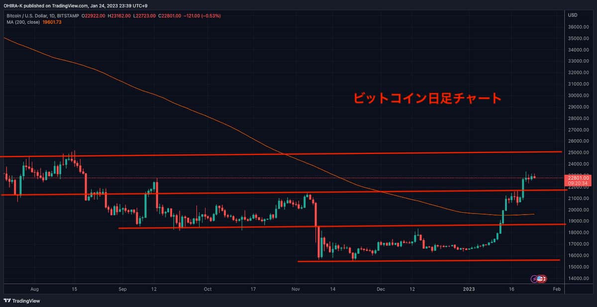 チャートのレンジ相場の上限と下限の価格に赤の水平ラインを引いてますが、今後の目標価格は25000ドルになりそうです。