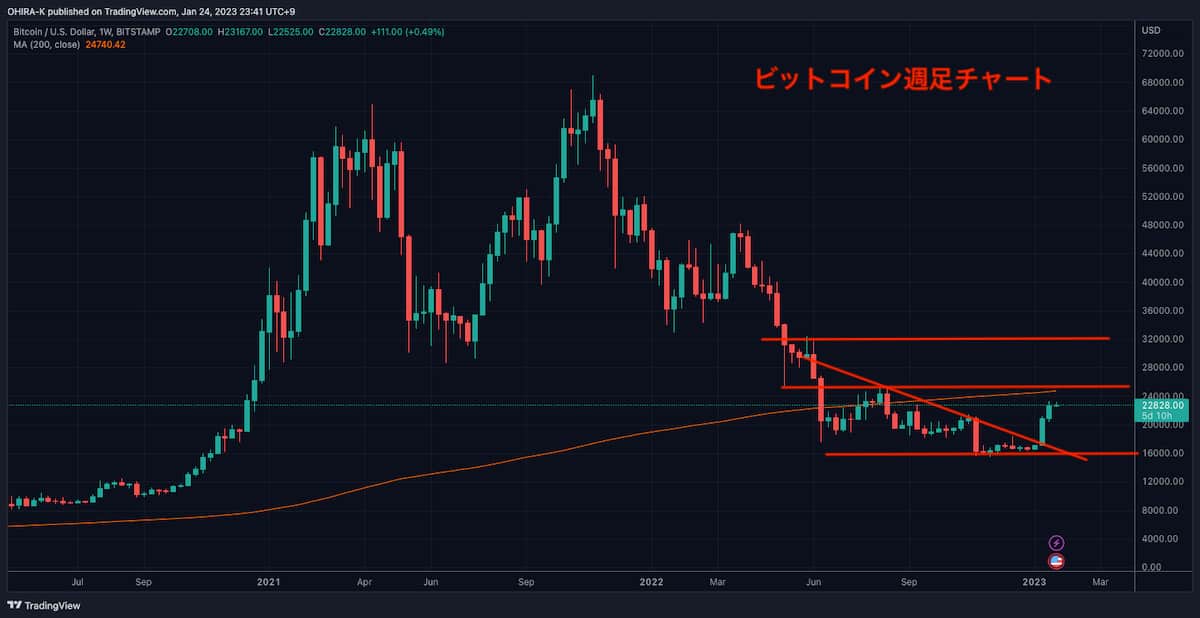 昨年末からの下落相場でのレンジを週足チャートで確認すると赤の水平ラインとなり、だいたい16000ドルから26000ドルがレンジ相場といえます。