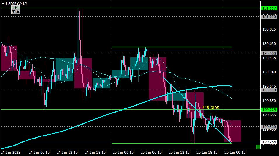 このまま大きく下がると思って朝までホールドしたが、下げ幅が小さかったので、昨日の安値でいったんイグジット。+90pips