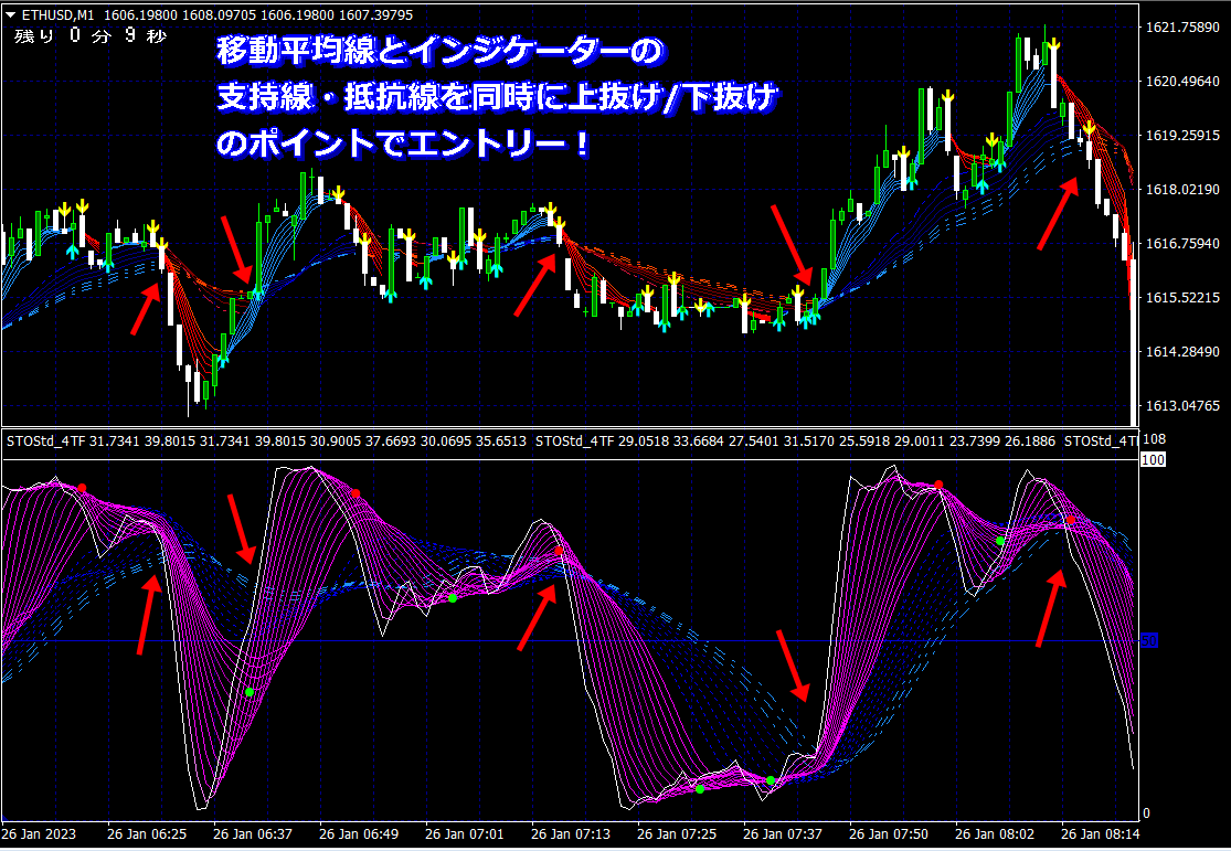 天底チャート(令和版)では、移動平均線だけでなくインジケーターの曲線帯にも