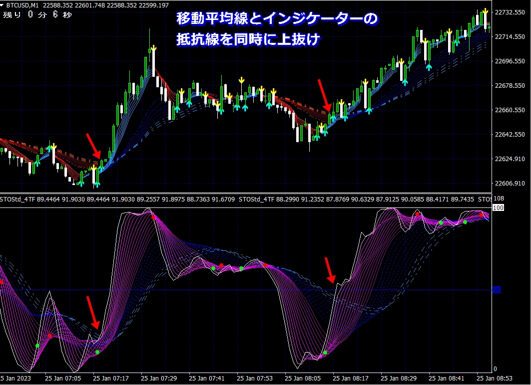 天底チャート(令和版)では、移動平均線だけでなくインジケーターの曲線帯にも