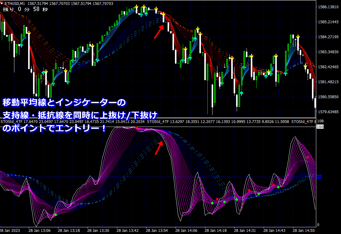 天底チャート(令和版)では、移動平均線だけでなくインジケーターの曲線帯にも