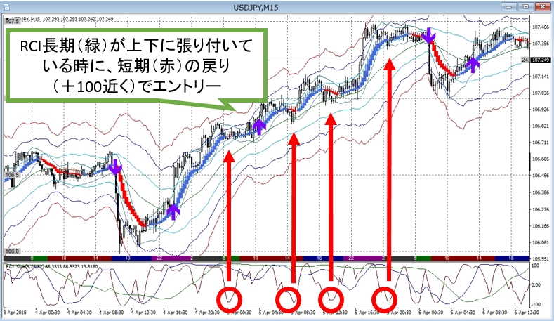 より短期の赤や青の波で押し目、戻り目のタイミングを拾うことができます。