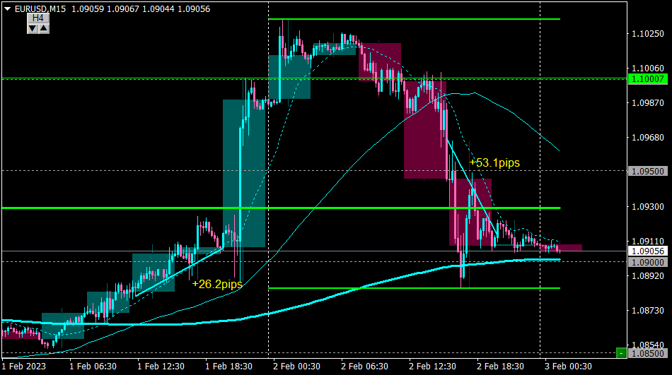 指標発表後の動きで下落し始めたところでショート。+53pips