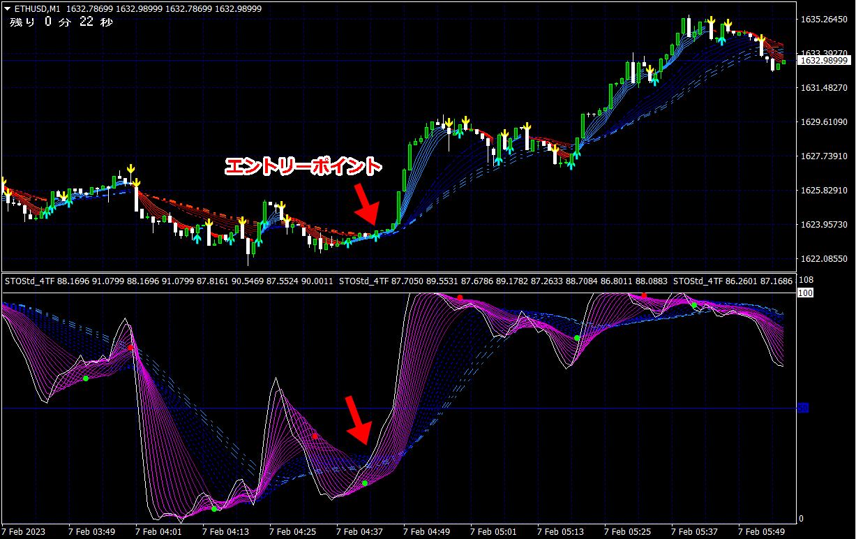 天底チャート(令和版)では、移動平均線だけでなくインジケーターの曲線帯にも