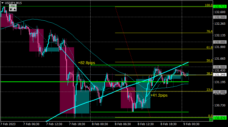 昨日は、前日陰線の戻り売りが入ったが、欧州時間に130.50で反発し切り上げのWボトムを作ったところでロング。+41pips
