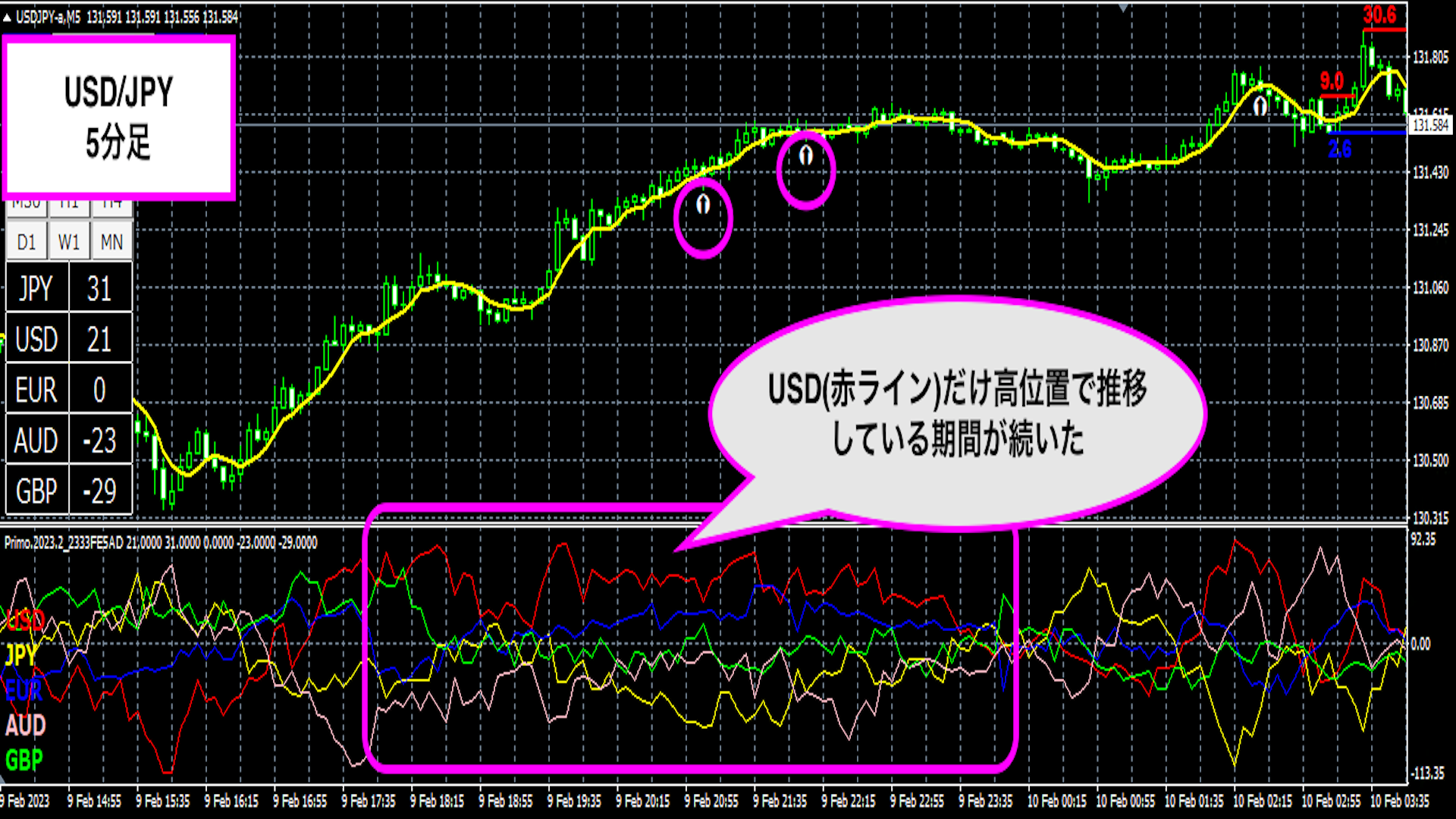 まずは5分足チャートでこのようにサブウィンドウで強弱差が大きく出ているところを探してみましょう。