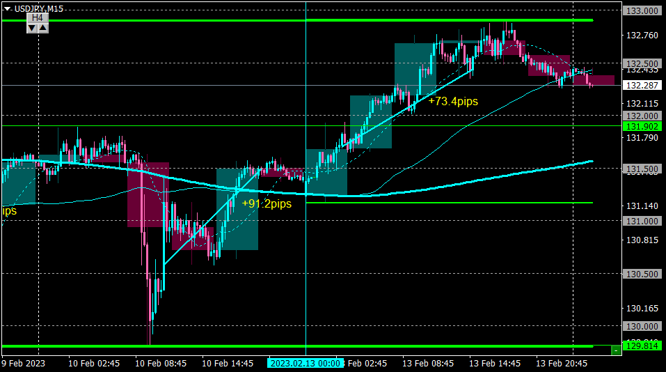 狙い通り上昇を続けて、次の強そうな節目133.0でダブルトップを作ったところでイグジット。+73pips