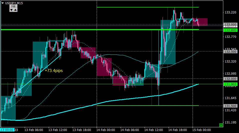 昨日は朝のシナリオ通りの展開で132.0で押し目を付ける動きになったが、ちょうど指標発表のタイミングの乱高下と重なったためエントリーせず。