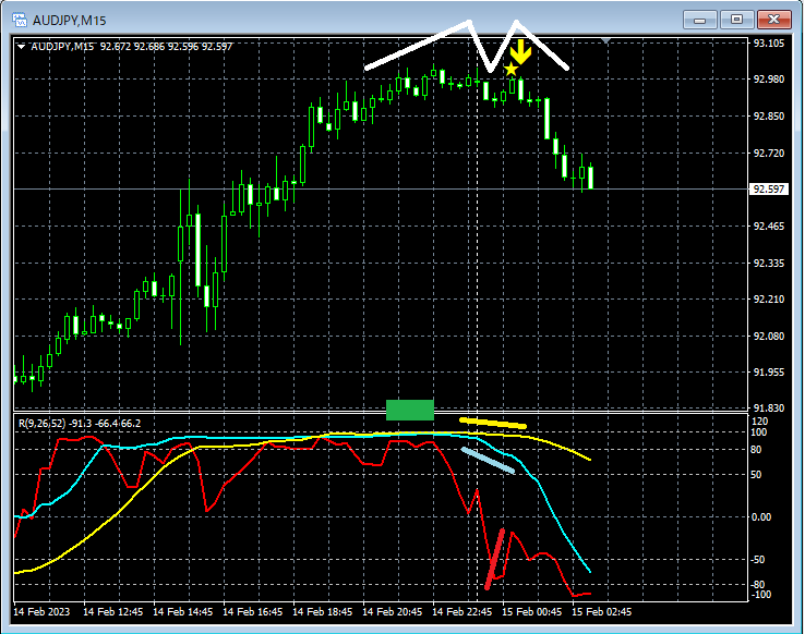 上の例では、ダブルトップ(あるいはそれに準ずる形)の左側の山でRCI3重天井(緑の四角)の形まで上昇している。