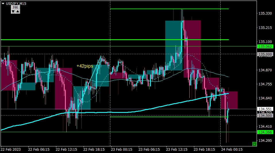 昨日は注目されていたレート135.0を上抜いたが、フェイクになる可能性を考えて下げ止まりを待っていたがそのまま下落。