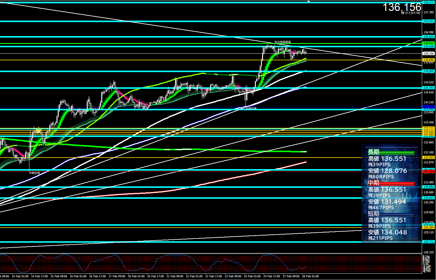 ①136.820円付近ブレイクは137円越えの期待値。この辺りは日足レベルでなかなかの止まり具合なので、136.428円を割ったら撤退。