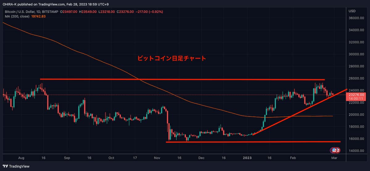 直近でビットコインは先々週の上昇から下落調整となっています。株価もさがっており、それに連動している形です。