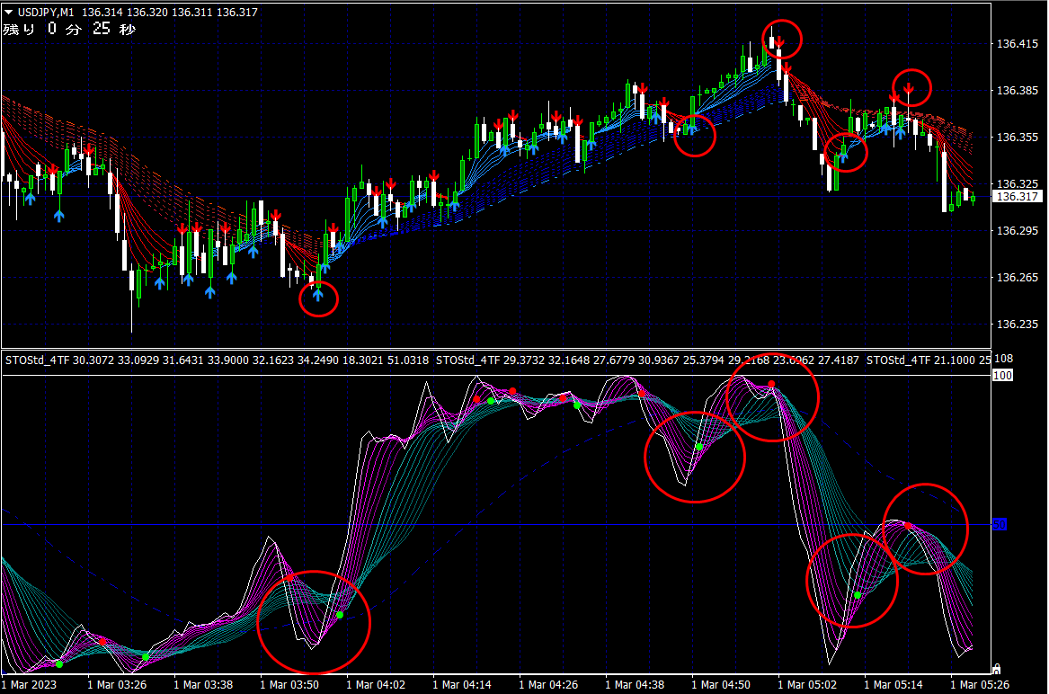 ※ 1分足用インジケーターとして説明しておりますが、当インジケーターは