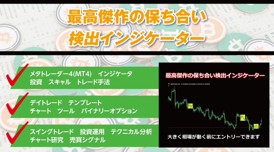 相場の保ち合い状態の箇所を検出します。保ち合い状態の後、上下のどちらかに大きくブレイクします。