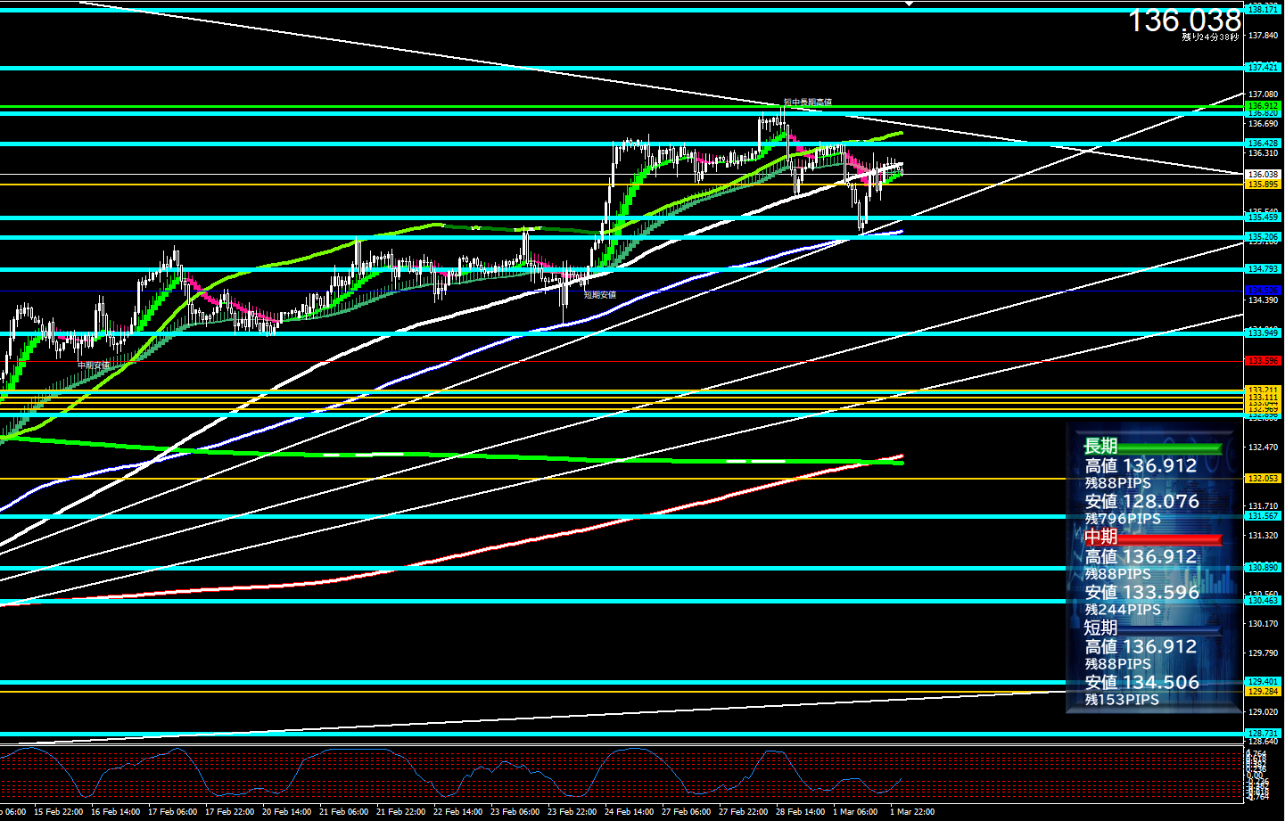 ①136.912円は直近の高値ブレイクと下降トレンドライン、Jcounterブレイクの期待値。