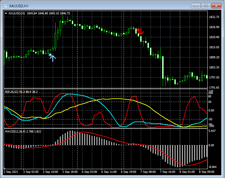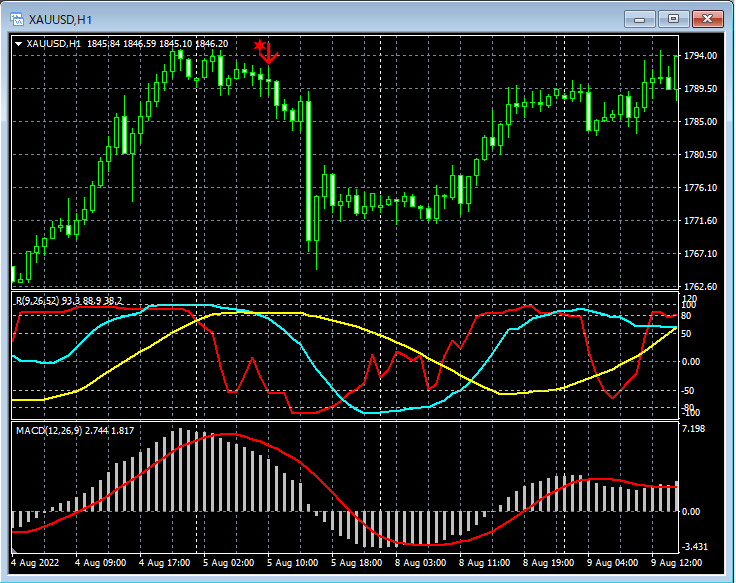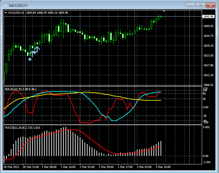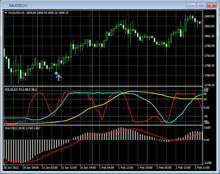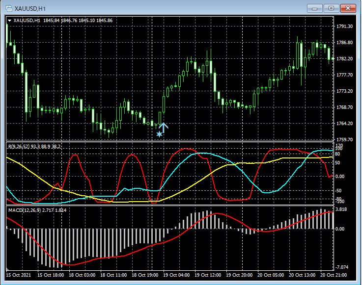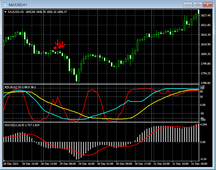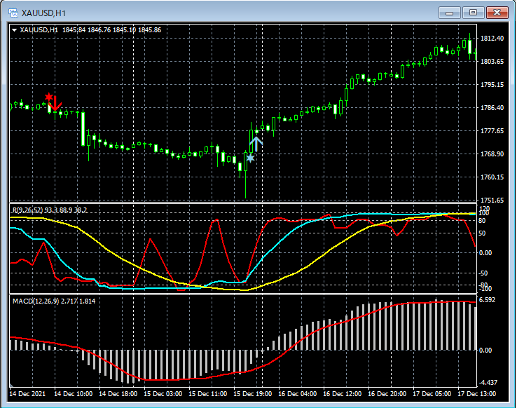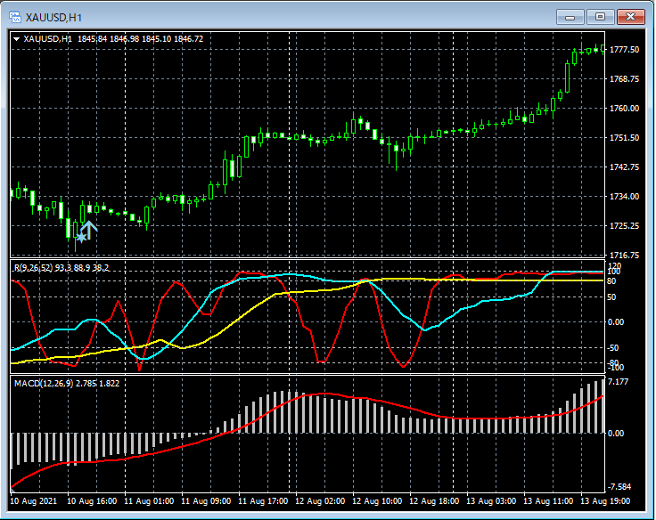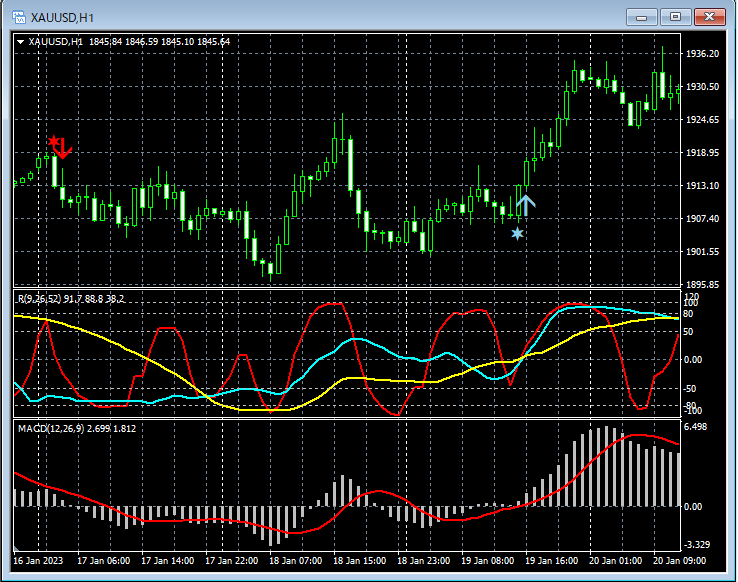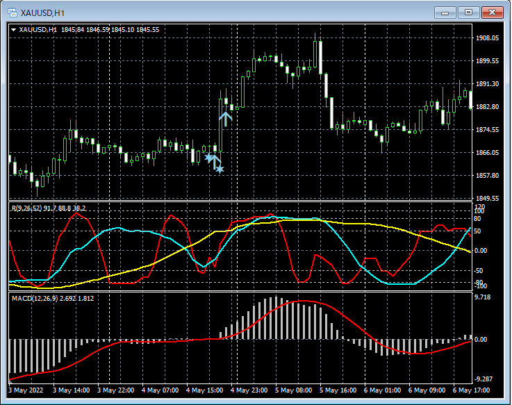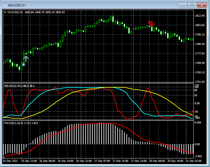 ◆R3MACDgcdc_RRFのサインの例(XAUUSD ゴールド 1時間足)