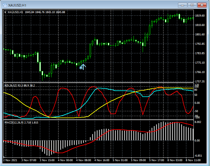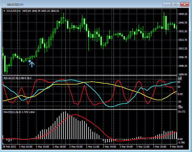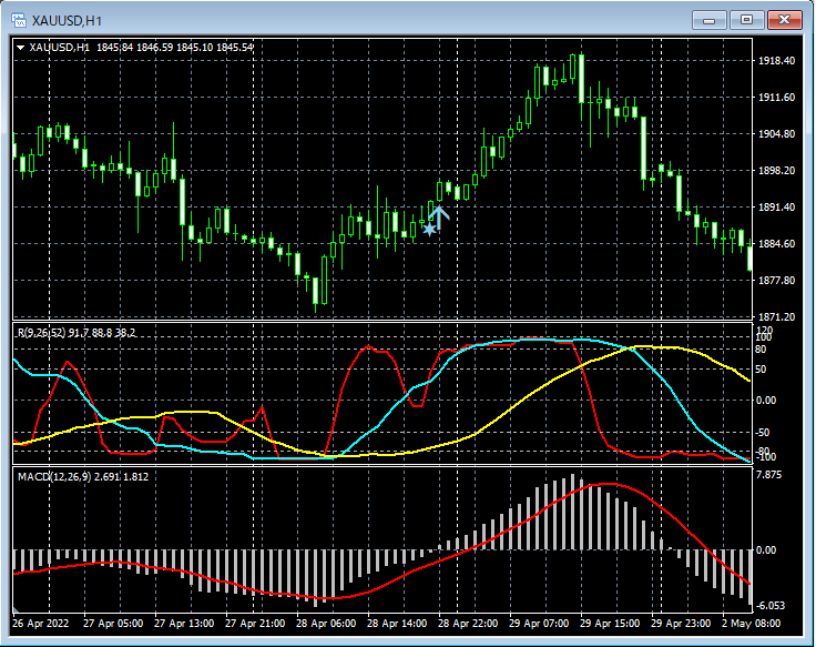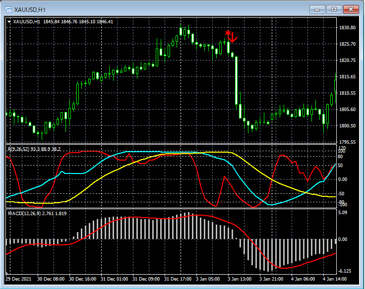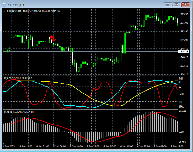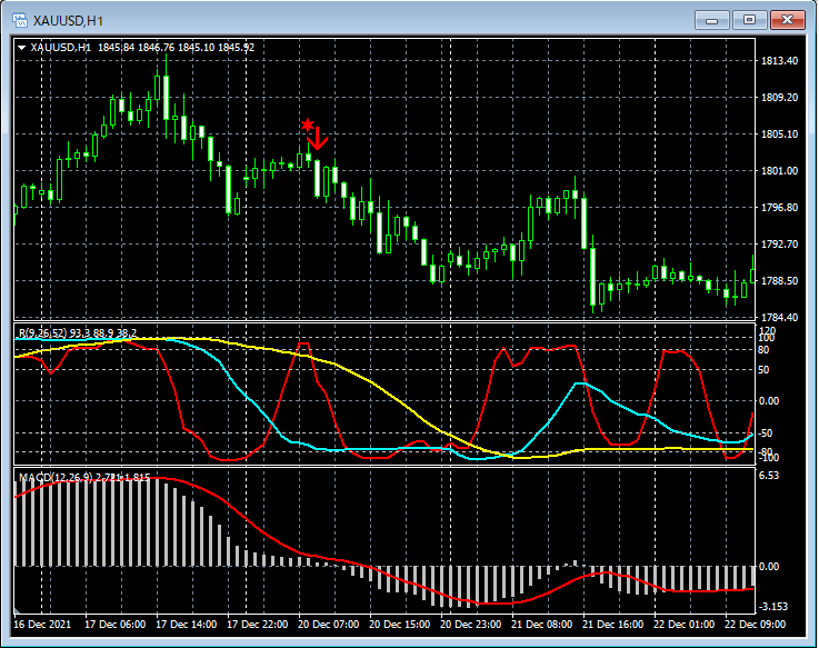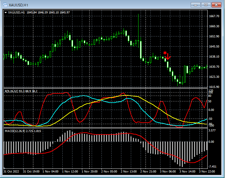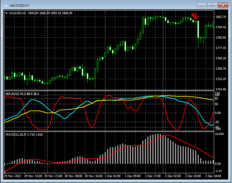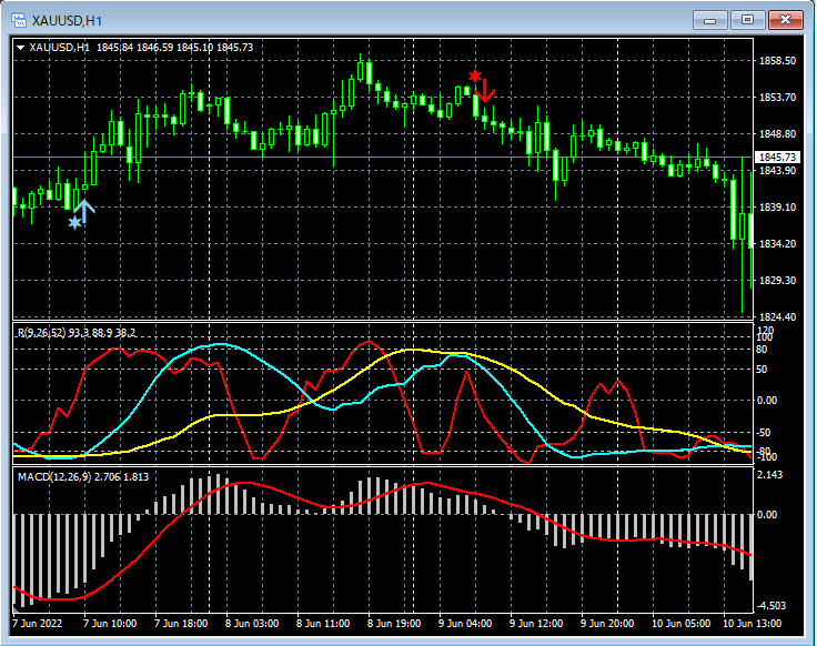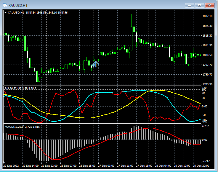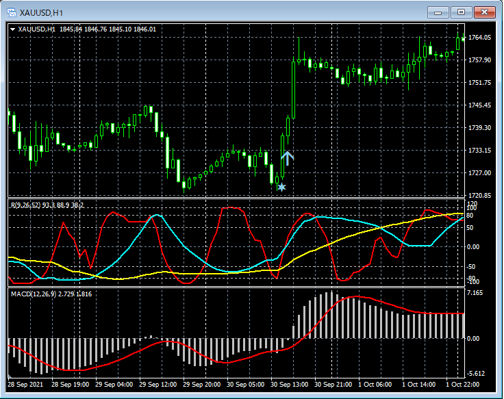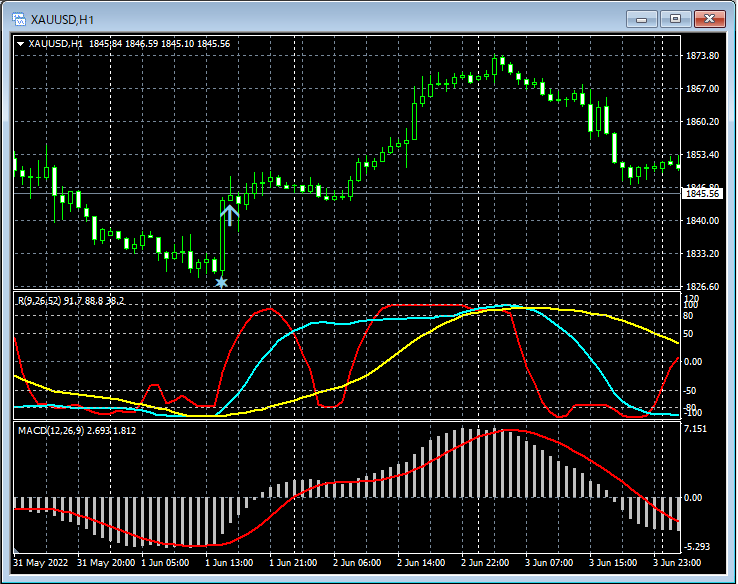 ◆R3MACDgcdc_RRFのサインの例(XAUUSD ゴールド 1時間足)