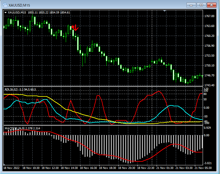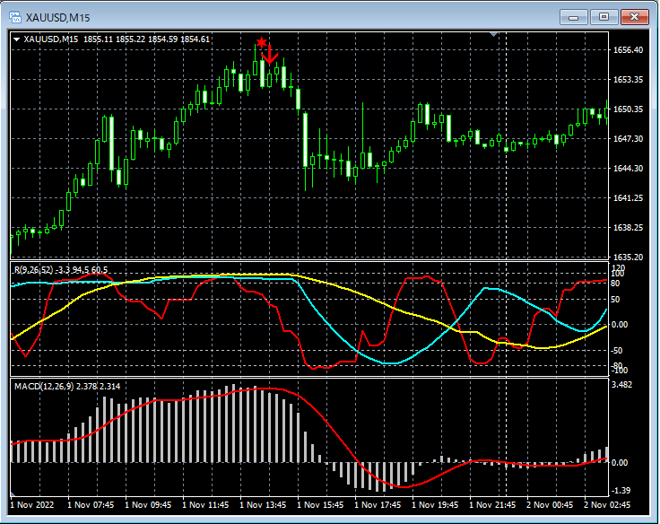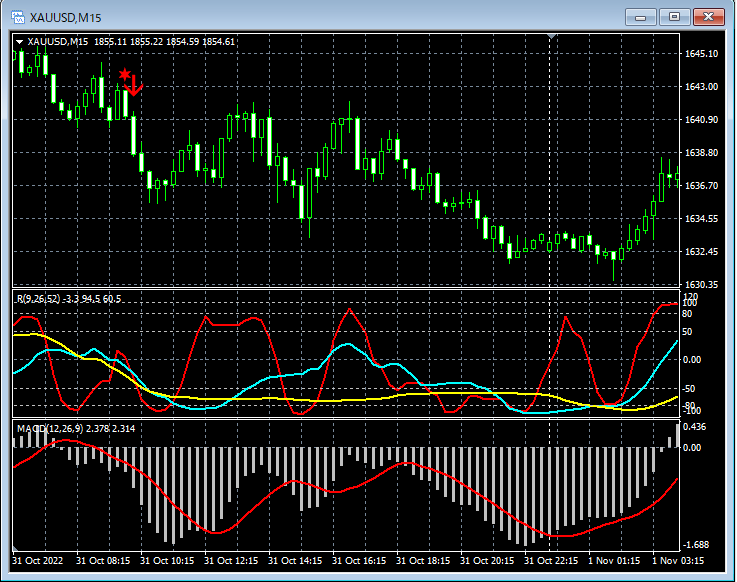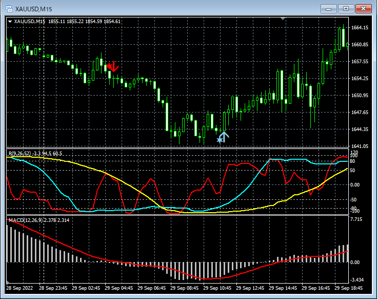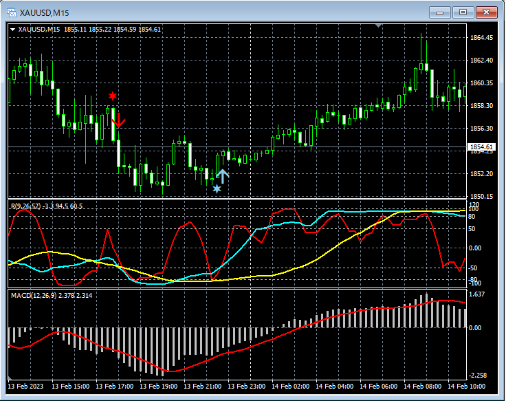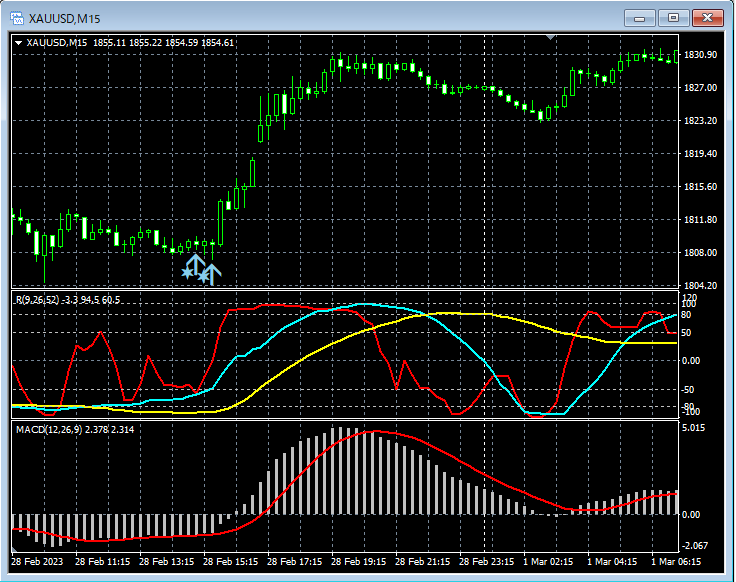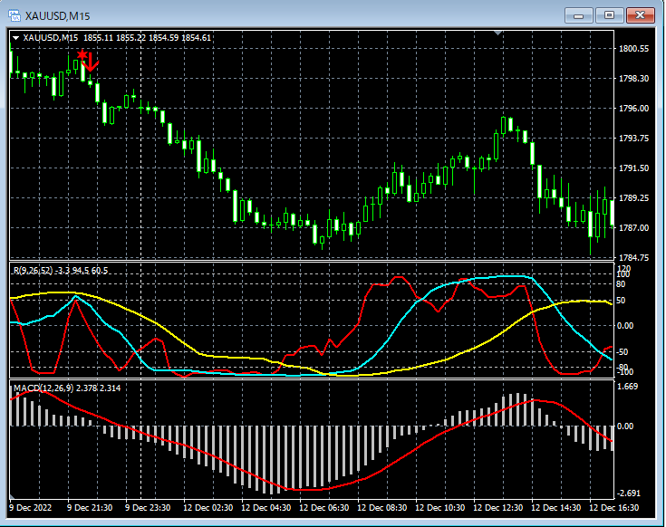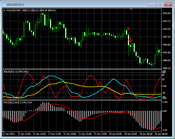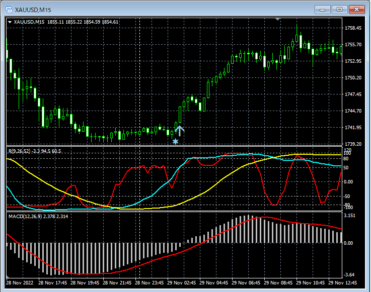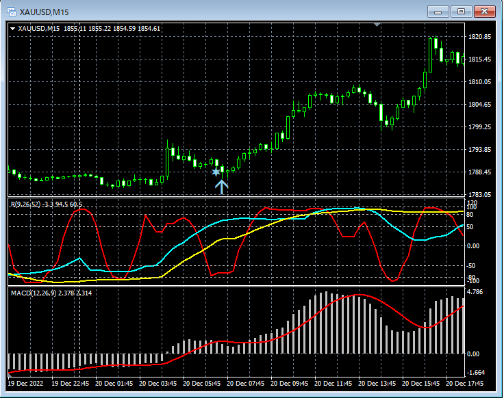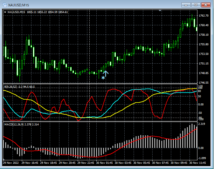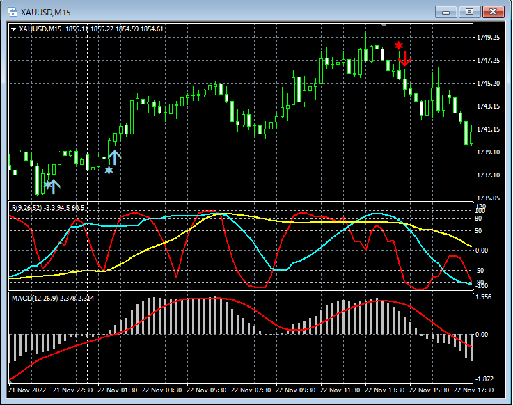 ◆R3MACDgcdc_RRFのサインの例(XAUUSD ゴールド 15分足)
